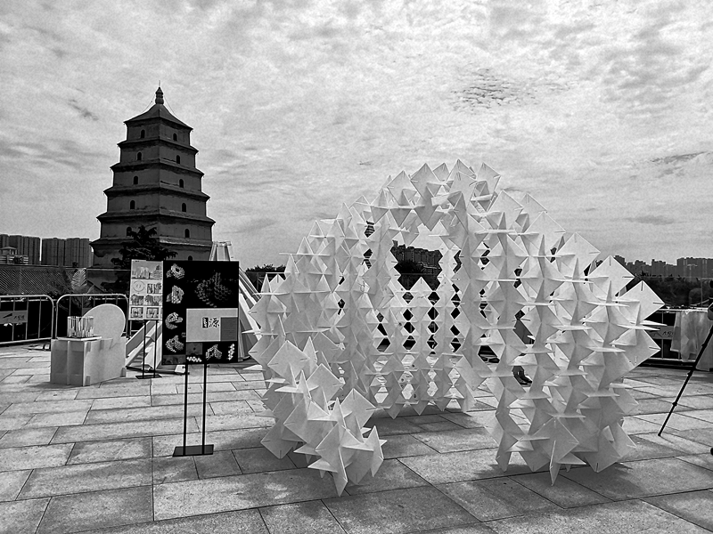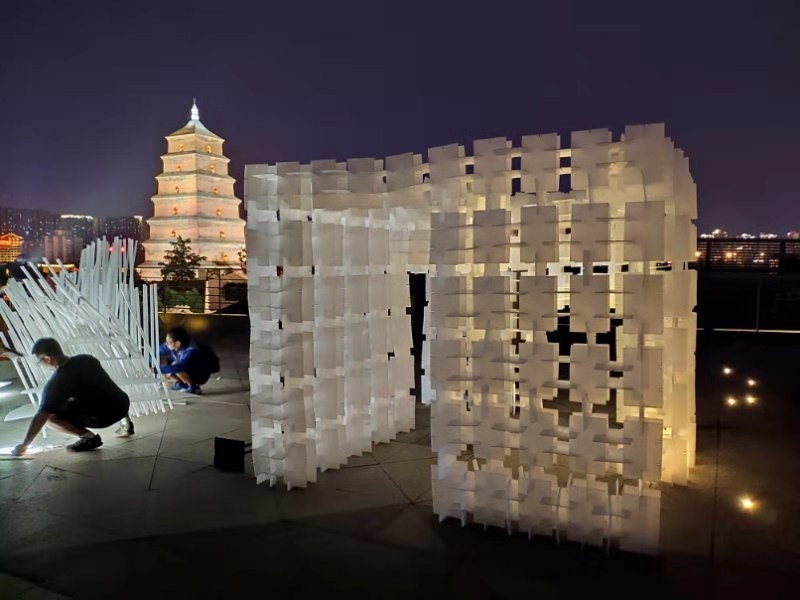 开幕式环节上,大赛组委会主席竺剡瑶详细介绍了决赛评分规则。根据决赛规则,16支队伍轮流向评审专家讲解创作思路与设计手法,充分展示搭建成果。围绕大赛主题“近未来——传承与演变建构”,各选手以丝路文化的历史传承作为创作源泉,以时代诠释的演变建构作为创新展望,充分考虑场地地域精神与文化内涵,通过对历史元素的转译、对周边环境的回应、对构造方式的尝试、对特定行为的关注等视角,打造出丰富而别具新意的独特空间。场地遥望西安城市名片古慈恩寺塔,俯瞰大唐不夜城,设计者通过材料、结构、空间要素等的高度统一,探索对历史元素的转译,对时代演变的诠释,以及对未来发展可能,最终实现对话古今与建构未来。