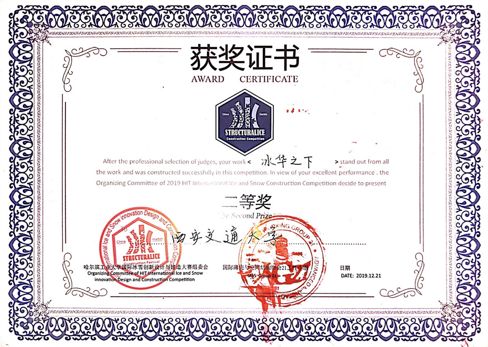 12月21日,为期6天的2019国际冰雪创新设计与建造大赛在哈尔滨工业大学圆满落下帷幕。由js33333金沙线路检测建筑系学子设计并搭建的“冰华之下”获二等奖,这是我校首次参加该赛事,并取得优异成绩。该奖项由国际薄壳与空间结构协会21工作小组、哈尔滨工业大学国际冰雪创新设计与建造大赛组委会共同评选产生。