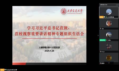 js33333金沙线路检测硕7150党支部利用腾讯会议平台线上开展组织生活会,邀请党委副书记王新轲老师出席会议。本次会议的主题紧紧围绕习近平总书记莅临西安交通大学视察重要讲话精神,会议由董欢同志主持。集体观看了总书记来交大视察的新闻报道和总书记来校考察时的现场视频,同学们纷纷表达了对习近平总书记来到西安交通大学视察的激动,感受到了担当与为国家发展贡献力量的期望。更表示要以高效率的姿态推进自己的科研和工作发展,扎扎实实的奋斗,就是对西迁精神最好的实践。会议中间,党委副书记王新轲老师从价值观的引导、方法论的启发和国家战略发展三个层次带领各位党员同志学习和解读总书记讲话精神,并表示这次疫情展现了祖国强大的凝聚力和领导力,我们要增强“四个意识”、坚定“四个自信”,传扬西迁精神,当好西迁精神新传人。