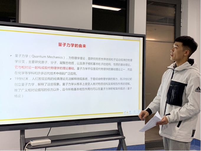入党积极分子夏振华同学以“量子力学的前世今生”为题开始领学,从量子力学的起源开始追溯,为大家讲解了量子力学从发现到未来发展的科学脉络,揭开量子力学的神秘面纱,同时介绍了我校理学院光量子研究所的概况并带领与会成员共同观看了量子科学与国家安全的相关视频。