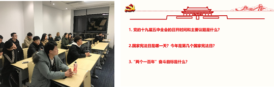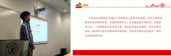 在宪法宣传专题中,缪骋宇向支部成员介绍了宪法之于我国法治建设的意义,宪法精神以及国家宪法日的设立背景。为弘扬宪法精神,维护宪法权威,王建和王亚辉带领支部成员进行宪法诵读活动,增强法制观念,为建设和谐社会、和谐校园打下法治基础。入党积极分子梁博武表示,作为一名研究生,我们最基本的就是要完善自己的法律观,树立法律信仰。只有从内心深处信仰宪法,才会自觉地去学习宪法知识,维护宪法权威。