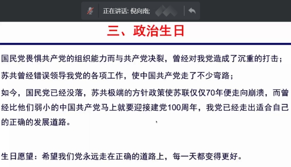 倪向南同志回顾了自己入党以来对党的观念认识的演变情况。他认为我们党应对新冠疫情的一系列举措,充分体现出了中国共产党优秀的组织管理能力和国家治理能力,党的坚强领导是中国人民巨大的凝聚力和向心力的关键。回顾历史,展望未来,倪向南同志在迎接建党100周年之际祝愿“我们党永远走在正确的道路上,每一天都变得更好!”。