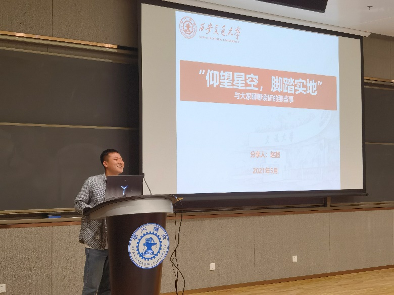 观看视频后,土木专业博士生赵超学长向大家作了题是“仰望星空,脚踏实地”的经验分享,分为三个部分:研究生的日常生活、伟人经历对我们的启发、以及对支部成员的寄语。