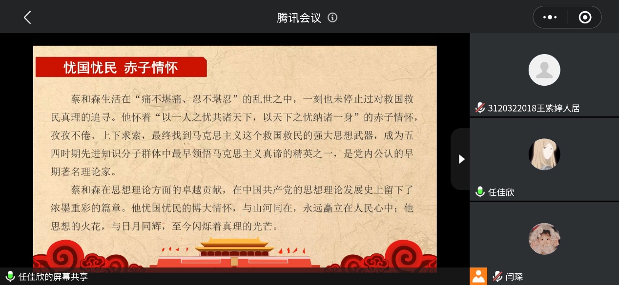 2021年5月25日晚,任佳欣和王梦莹对蔡和森同志的英雄事迹做了讲解,并号召支部成员们学习蔡和森精神。她们首先回忆了蔡和森同志的革命岁月,并对蔡和森同志的主要成就进行了概括。