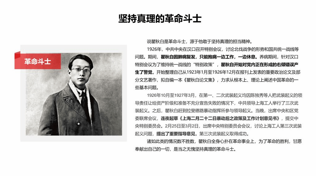 此次宣讲,景枫林从人物生平、主要事迹、人物评价、人物影响四个方面来展开讲述,让大家对瞿秋白短暂又光芒四射的一生有了深刻认识。瞿秋白生于清末,早年接受中国旧式私塾教育,后考入外交部学习俄。随着当时革命形势的发展,瞿秋白逐渐受到革命启蒙思想的影响,后来赴莫斯科采访,在安德莱厅同革命导师列宁进行了简短交谈。1922年春,瞿秋白正式加入中国共产党。瞿秋白为马克思主义早期在中国的宣传和研究工作,为中国共产党早期思想理论建设作出开创性的贡献,同期他出席中国国民党第一次全国代表大会,参加大会宣言的起草,并任中央政治委员会委员,为推进国共合作、发动北伐战争和反对国民党右派进攻,作出了卓越贡献。景枫林说道,瞿秋白加入革命事业后,全身心扑在革命事业上,为了革命的胜利,甘愿奉献出自己的一切,是当之无愧坚持真理的革命斗士。