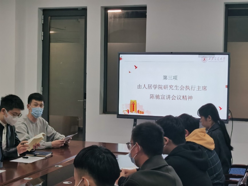 会议第三项,陈驰向与会同学详细介绍了本次会议的精神,并传达了学校对即将召开的西安交通大学第十二次研究生代表大会的相关通知。
