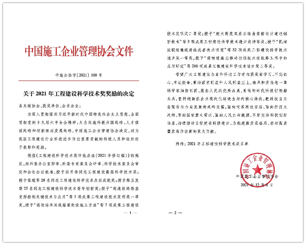 工程建设科学技术奖包括最高科学技术奖、技术发明奖和科学技术进步奖。旨在提高工程建设行业在工程管理、节能减排、绿色环保、工程咨询、勘察设计、建造方式和技术、施工装备、建筑材料等方面的自主创新能力和水平。奖项评选范围涵盖了冶金、有色、煤炭、石油、石化、化工、电力、水利、核工业、林业、航空航天、建材、铁路、公路、水运、通信、房屋建筑和市政公用等工程建设各个行业(专业),贯穿工程建设各个环节。2021年工程建设科学技术奖科学技术进步奖全国范围内共评出特等奖3项,一等奖52项,二等奖288项。