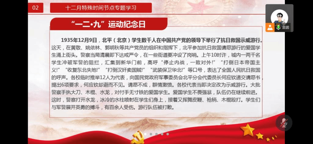 随后进行会议第二部分,共同学习了一二·九运动的背景、过程和意义,一二·九运动“促进了国内和平和对日抗战,使抗日运动成为全国的运动”;并继承和发扬了五四以来优良传统,有力地昭示了中国青年运动应当坚持的正确方向。而后观看了“国家公祭日”相关视频,回顾了那段不堪回首的历史。悼念南京大屠杀中的死难者和所有在日本帝国主义侵华战争期间惨遭日本侵略者杀戮的所有死难同胞(包含慰安妇)的同时,广大团员应铭记历史,珍视和平,警示未来。振兴中华,吾辈自强!