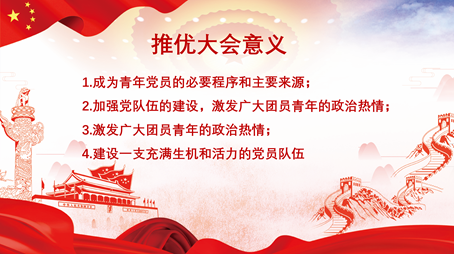 随后进入民主评议环节,根据投票结果,确定8人入选推优人员。最后,团支书余恩得同志总结发言,希望各位同志在以后的学习,生活中以党员的标准来严格要求自己,积极上进,服务同学,帮助其他同学共同进步,不断提升自我,积极向党组织靠拢,为党凝聚优秀力量。