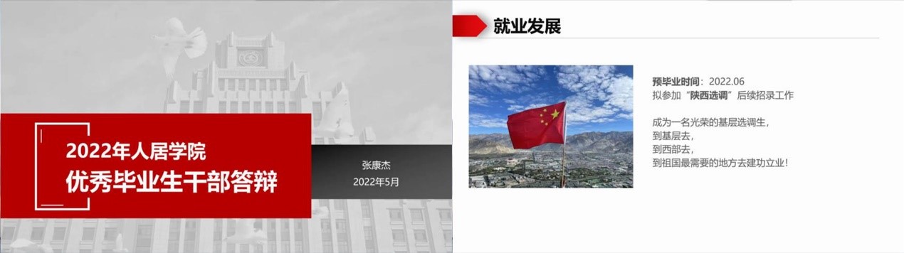 答辩开始前,杜文静根据学校文件解读了优秀毕业生干部的评定标准、评审程序并宣布了答辩次序。随后,8名优秀毕业生干部候选人忆往昔、谈总结、悟思想、话未来,依次就科研成绩、荣誉奖励、工作事迹、社会实践和就业情况进行汇报。