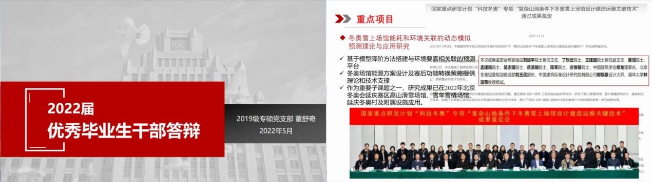 2019级专硕党支部副书记董舒奇参与了《冬奥雪上场馆能耗和环境关联的动态模拟预测理论与应用研究》、《新型可扩展核心平行类方法在绿色建筑环境模拟中应用》等多项重点项目,真正做到把所学知识应用到实际建设中,把科研成果转化在祖国大地上。