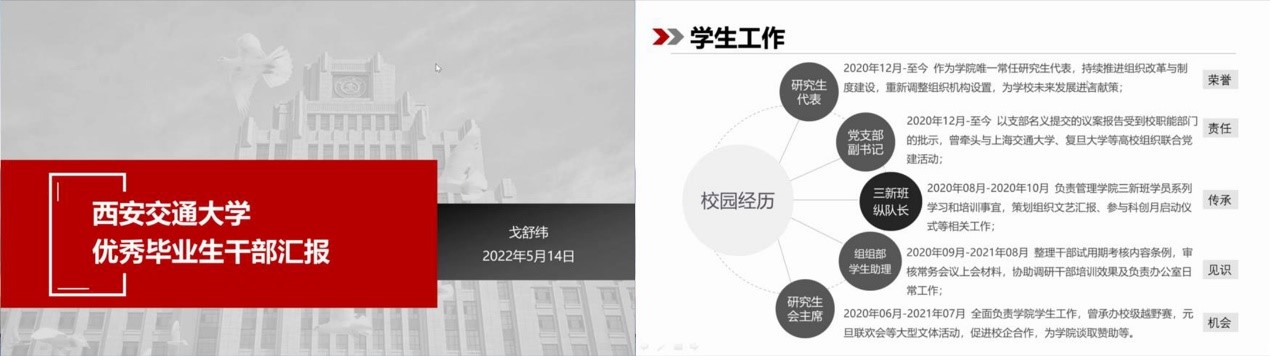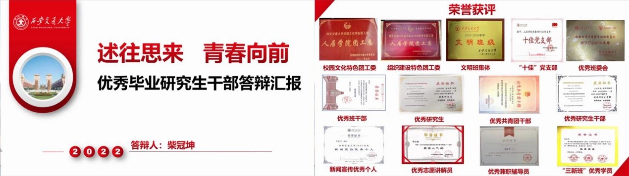2019级学硕团支部书记、班长柴冠坤以“精勤求学,敦笃励志,果毅力行,忠恕任事”的校训为落脚点,深入总结了任校党委组织部、宣传部学生助管、院团工委副书记、班长等职务的工作成果与经验。她说:“作为西迁新传人,争创世界一流,平衡东西差距,是我们不懈追求的目标。我也将传承西迁先贤们不变的红色精神,在西部砥砺青春,成就自我,践行‘向西向远方’,‘为世界之光’的西迁精神内涵。”