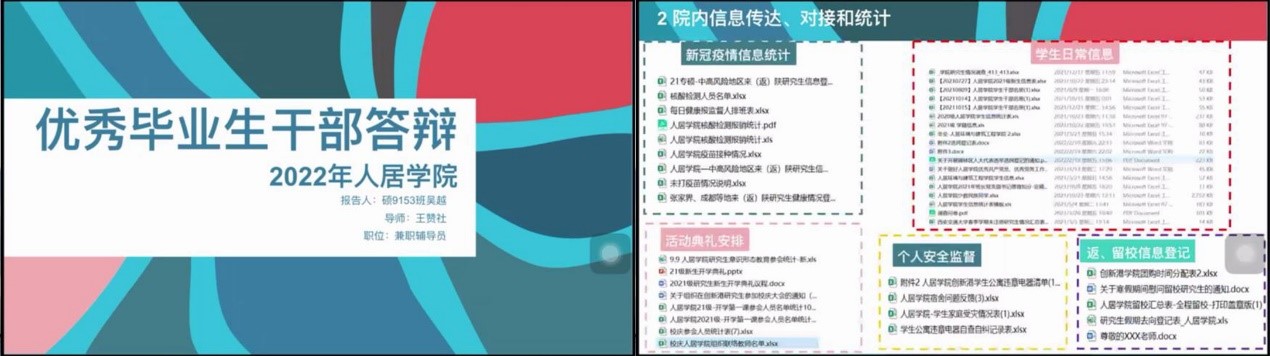 5月14日晚,js33333金沙线路检测2022届春夏学期优秀毕业生干部答辩会议于线上举行。答辩评审小组由学院副院长许领、党委副书记王新轲、土木工程系党支部书记徐晗、建筑学系副主任王非、地球环境科学系副主任苏军伟、党委秘书汪毅香、辅导员杜文静、陶泽宇组成,各年级学生干部参会,会议由王新轲主持。经各党团支部研究推荐,本次有8名优秀毕业生干部候选人参与答辩。