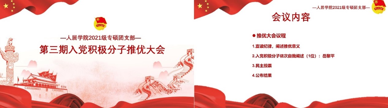 会议第三部分,由团支部书记余恩得主持开展第三期入党积极分子推优大会。经过统计出席本次大会的团员人数,超过了团支部总数的三分之二,确定了会议的有效性,推优大会正式拉开帷幕。由团支书宣读会场纪律,讲解投票方式、投票规则、注意事项,阐述团内入党推优的意义,推优候选人岳黎平根据自身具体实际情况分别从入党动机、生活、学习中表现以及个人价值理念进行自我阐述。本次大会顺利开展,也希望支部的每位成员能够不忘初心,牢记使命,向先进党员学习,不断提升自身素质,积极地向党组织靠拢,与党同行,共同发展。