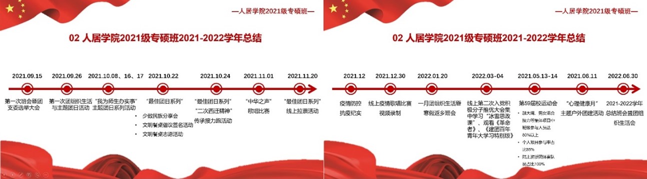 会议第二部分,由班长江瑞对班级2021-2022学年的班级建设工作进行总结,利用时间线带大家一起回顾过去一年中支部发生的“大事”,展示合照,让大家一起珍惜来之不易的友谊。回望过去,是为了更好地前行。同学们的研一生活即将画上句号,我们将要迈上稳定发展的新征程。感谢同学们过去一年的支持和包容,班级建设也在一次次反思中不断完善与发展。