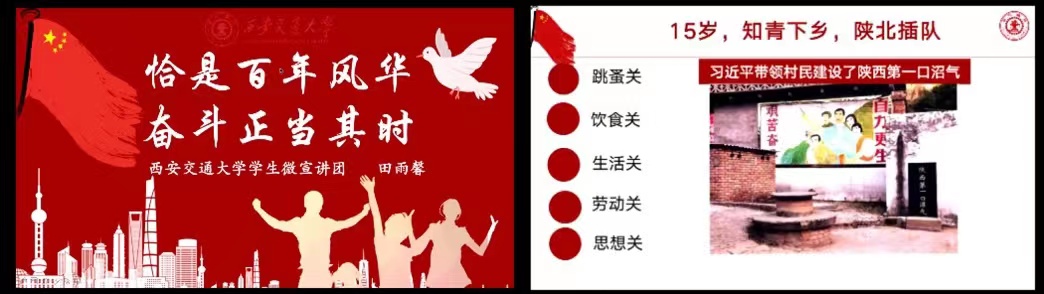 微宣讲团田雨馨同志在“恰是百年风华,奋斗正当其时”的主题宣讲中讲述了:习近平总书记为实现中华民族伟大复兴扎根西部基层的故事,他把最珍贵的青春岁月,留在了梁家河这个山沟里。习近平总书记有追求、能吃苦、敢担当,无私奉献,迎难而上。他扎根西部的真实故事,更加坚定了交大学子为祖国繁荣奉献青春的信心和决心。无论是庚子年初面对突如其来的新冠肺炎疫情,无数青年医务人员主动请缨,奔赴战“疫”第一线。一句‘穿上防护服,我们就不是孩子’。让全国人看到了中国青年的担当。2021年7月,在抗洪救灾现场,青年突击队的旗帜高高飘扬,面对临时断电、暴雨滂沱、道路积水等复杂环境问题,青年人筑起了“青春堤坝”,保障了广大人民的生命安全。在庆祝中国共产党成立一百周年大会上,青年人们在天安门广场上喊出“请党放心,强国有我!”的响亮口号,这是青年一代对党和国家许下的青春誓言。