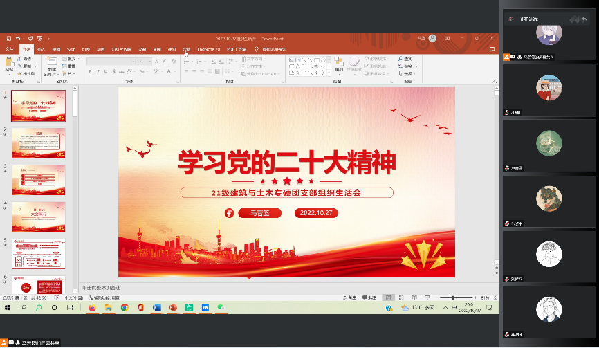 为深入学习宣传贯彻党的二十大精神,重温中国共产党百年奋斗历程,传承红色基因,js33333金沙线路检测2021级建筑与土木专硕团支部于2022年10月27日晚通过线上方式开展了“学习党的二十大精神”主题团组织生活会。会议由团支部书记马若篮主持,共47名支部团员参与。