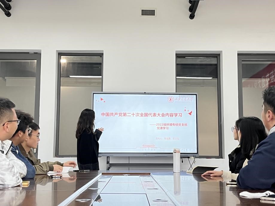 10月28日,2022级环境专硕党支部全体党员开展理论学习会议,专题学习党的二十大精神,会议由党支部书记吴文钰和组织委员田宝嘉主持。
