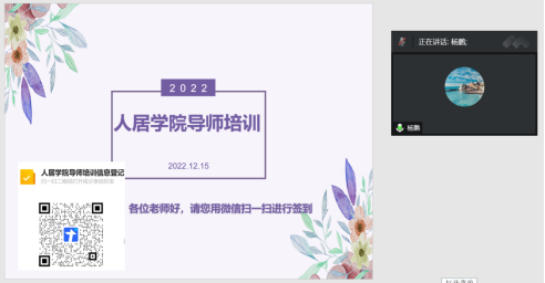 学院党委书记杨鹏针对学院对研究生培养质量要求作了简要介绍,学院从过程的管理、文件的出台、导师的指导层层把关,尤其是因疫情给整个培养工作带来了很大的挑战,对导师们提出应对学生的指导不放松、对学生的关心不放松、对学生的政治教育与引导不放松、论文质量严把关的要求。