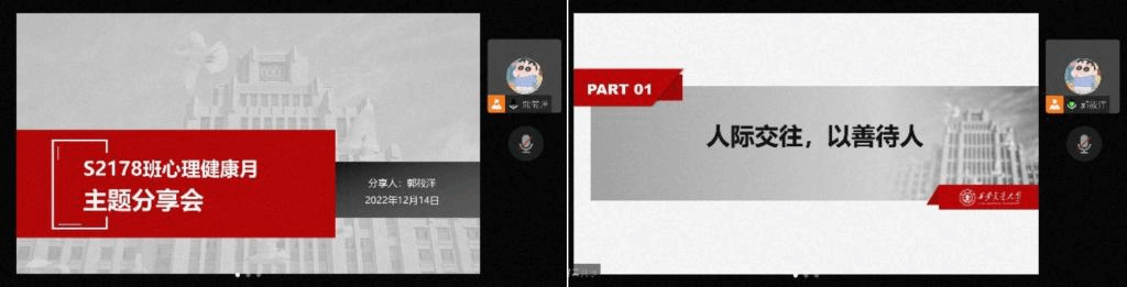 为宣传普及心理健康知识,深入开展心理健康教育,聚焦同学们在人际交往与恋爱情感上的困惑与突显问题,硕2178班于12月14日晚线上开展了“人际交往与恋爱心理”主题分享会。会议由班长郭筱洋主持。