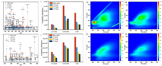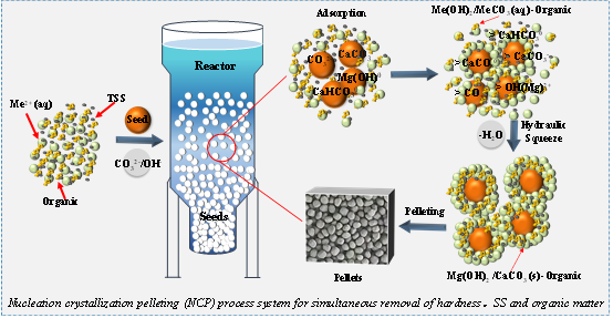 针对压裂废水中硬度、有机物和SS的同步去除。本研究引入了一种创新的核晶造粒(NCP)工艺,用于高效处理压裂废水。通过在设备中预先引入具有活性位点的专用晶种,投加Na2CO3和NaOH,使得三级串联的NCP系统对总硬度的去除率达到95.6%,对TSS的去除率达到90.1%,对COD的去除率达到31.1%,并使得出水硬度由8000 mg/L左右降至300 mg/L以下。通过表征分析,最终Ca2+和Mg2+以CaCO3、Mg(OH)2和Mg0.03Ca0.97CO3附着于专用晶种上(图1)。蛋白质类化合物、芳香族蛋白质类化合物和腐殖酸类物质等有机物通过共沉淀和表面络合作用去除(图2),而SS则由于体积作用力附着在颗粒表面。专用晶种在三个重复使用周期内表现稳定,证实了种子的稳定性、效率和可重复性(图3)。与此同时,开发了一体化设备,并建立了50 m3/h的三级串联示范工程,连续运行120 h后证明出水水质稳定,处理过程中形成的致密颗粒(约1.2毫米)无需额外处理(图4)。DFT计算表明,废水中的有机物可通过H键和π-π堆积等相互作用与Ca/Mg离子形成稳定的“Ca/Mg-有机物”(ΔG < 0),加入Na2CO3/NaOH后,Ca/Mg离子在晶种表面沉淀为CaCO3、Mg(OH)2和Mg0.03Ca0.97CO3。同时有机物被共沉淀去除,SS被包裹去除(图5)。这项研究为解决压裂废水就地处理提供了一种创新、持续的解决方案,并为NCP技术的工业化应用提供了参考范例。