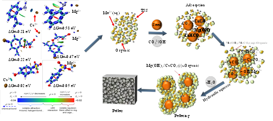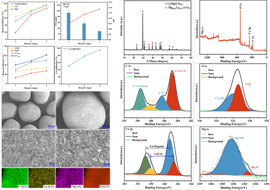 ●  优化了核晶造粒的工艺条件,通过DFT计算及多尺度表征(XPS、SEM等)阐明了在高pH值条件下,钙、镁离子的共沉淀是去除有机物的主要机制。