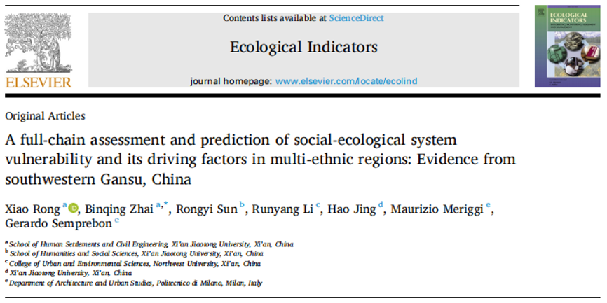 近日,js33333金沙线路检测翟斌庆教授团队,联合米兰理工大学建筑与城市研究系Maurizio Meriggie教授与Gerardo Semprebon教授在环境科学与生态学领域顶刊《Ecological Indicators》(中科院1区,IF = 7.4)上发表论文“A full-chain assessment and prediction of social-ecological system vulnerability and its driving factors in multi-ethnic regions: Evidence from southwestern Gansu, China”。该文章跨时序探讨了甘肃西南多民族地区社会生态系统脆弱性的复杂性与异质性驱动机制,拓展了社会生态系统脆弱性研究的应用情境和理论内涵,特别是提供了高精度机器学习模型在复杂系统脆弱性分析与预测中的实证,为制定符合地方特色的可持续发展和差异化风险管理策略提供了科学依据。文章第一作者为博士生戎晓,通讯作者为翟斌庆教授。