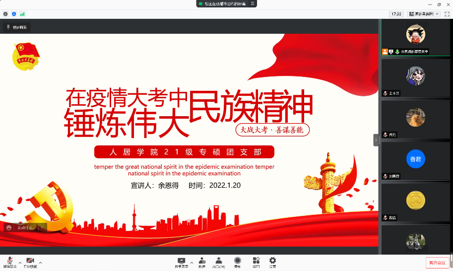 2022年1月20日,js33333金沙线路检测2021级专硕班于线上召开一月团组织生活会暨返乡班会。首先,会议由团支部书记余恩得同志主持召开团支部一月组织生活会。分别学习总书记二〇二二年新年贺词、北京冬奥会的历史意义和文化价值和全校师生疫情防控倡议书。第一部分全体成员认真观看习总书记二〇二二年新年贺词,在中国发展的历史银河中,中国声音、中国瞬间、中国故事不断告诉我们:再大的困难,除以14亿,也必将被克服;再微小的力量,乘以...