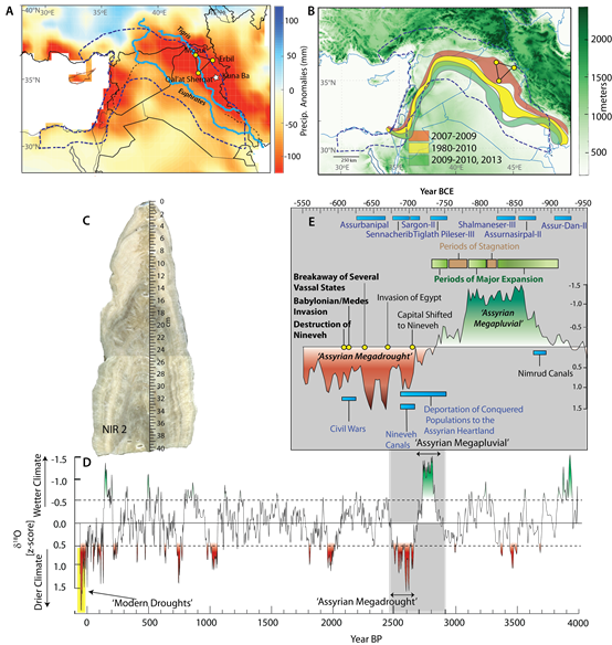 北京时间2019年11月14日凌晨3:00,Science子刊 Science Advances在线刊发了程海教授团队和美国加州州立大学Ashish Sinha教授等的最新研究成果--气候变化在新亚述帝国兴衰中的作用 (Role of Climate in the Rise and Fall of the Neo-Assyrian Empire)。 图1 (A) 新亚述帝国宫殿复原图。1945年在Nimrud(新亚述帝国早期首都,毁于公元前612年)被挖掘,1849年Austen Henry Layard重绘(纽约公共图书馆,digitalcollections.ny...