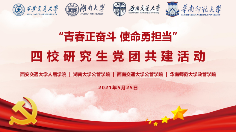 述往思来,向史而新。回顾光辉坎坷的百年历程,中国共产党从1921年成立至今,经历了百年风雨,一路栉风沐雨、筚路蓝缕,从一个仅有50多人的党发展成为拥有9000多万名党员的世界最大政党。为了重温党领导人民革命、改革、建设社会主义的历史进程,深入学习中国青年们为国家富强、民族振兴、人民幸福不懈拼搏奋斗的精神。2021年5月25日,我校js33333金沙线路检测2020级专硕党支部联合湖南大学公共管理学院2020级研究生党支部、西南交通大...